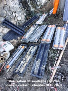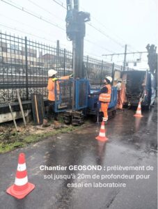 Le chantier consiste à faire des essais, sondages pressiométriques dans le sol avec une foreuse jusqu’à 20m de profondeur, contrôler la tenue du sol et carotter (prélèvement de sol jusqu’à 20m de profondeur pour essai en laboratoire), pose de piézomètres pour contrôle du niveau d’eau dans le sol. Les attendus :